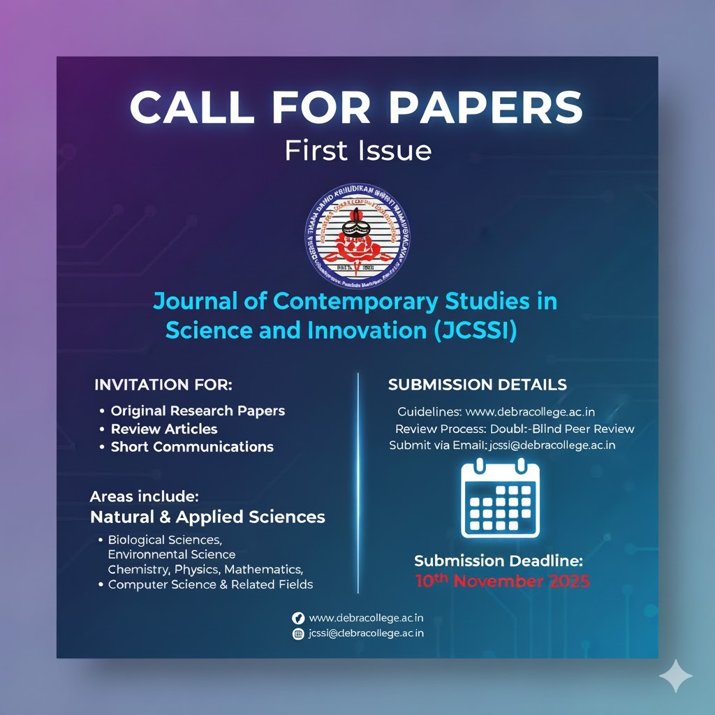 The Journal of Contemporary Studies in Science and Innovation (JCSSI) is a peer-reviewed, open-access, international bi-annual journal published by Debra Thana Sahid Kshudiram Smriti Mahavidyalaya (Autonomous). It aims to promote high-quality original research, review articles, and short communications in the broad fields of Natural and Applied Sciences, including Biological Sciences, Environmental and Earth Sciences, Chemistry, Physics, Mathematics, Computer Science, Agriculture, and related disciplines. The journal provides a platform for researchers, academicians, and practitioners to share innovative ideas, methodologies, and discoveries that contribute to scientific advancement and technological innovation. JCSSI follows a double-blind peer review process to ensure the integrity, quality, and originality of all published works.